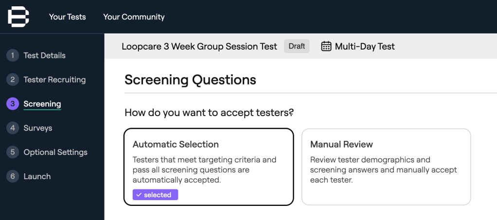 - Automatic Screening: Testers who meet all your predefined criteria are automatically accepted into the test, expediting the recruitment process.